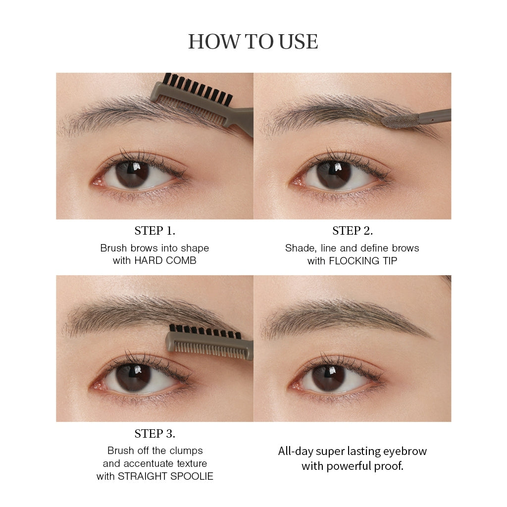 How to Use : Use the pointed part of the tip to outline your brows, then naturally fill them in using the slanted part of the tip. Before and after applying, gently comb your brows along the grain of the hair with the hard comb and straight brush.