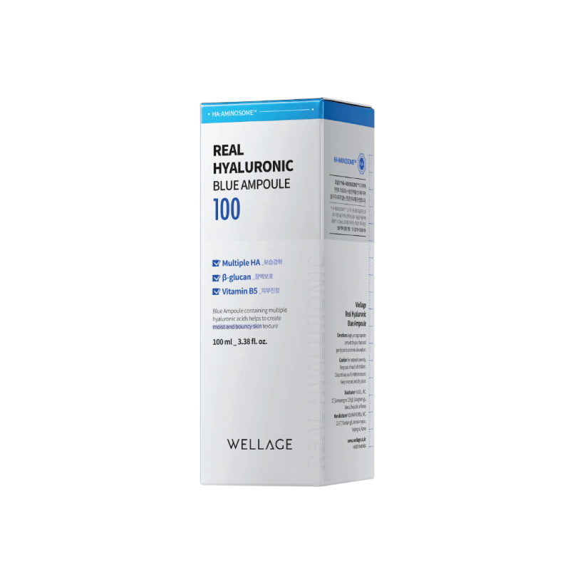Wellage Real Hyaluronic blue ampoule 100ml. Stable moisture absorption and retention by the same type of hyaluronic acid found in human skin. Concentrated moisture-resilient ampoule stacked in 9 types of HA, A layer of elastic layer stacked with eight hyaluronic acids of patented HA-AMINOSOMETM, HyAL-BOOSTER ultra-low molecular weight of 2,000 Da, a patent ingredient, enables high-adhesive moisturizing power Contains panthenol, beta-glucan, effective for skin calming.